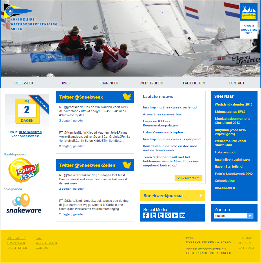 Ook tijdens de Sneekweek zal Snakeware de informatievoorziening door de Koninklijke Watersportvereniging Sneek via alle mogelijke middelen ondersteunen. De twitteraccounts @sneekweek en @sneekweekzeilen tellen samen al meer dan 2.500 volgers en worden ingezet voor algemene informatie en mededelingen van het wedstrijdcomité. Uiteraard zijn deze ook weer gekoppeld aan de site, zodat er niet gezocht hoeft te worden naar alle relevante informatie. Ate van der Meer geeft een toelichting: “Zeilers zoeken gerichte informatie. In het begin gaat het met name om informatie over het inschrijven en hoe het staat met de deelname van de eigen klasse. Naarmate de Sneekweek dichterbij komt, wil de zeiler ook meer informatie over de wind en de mededelingen van het wedstrijd comité. Deze informatie wordt zowel via de site als via Twitter en Facebook verspreid. Rondom de evenementen die de KWS organiseert vindt ook een uitgebreide informatievoorziening plaats. Door dit deels via de site en deels via Social Media te doen, is de service aan de deelnemers van de Sneekweek weer optimaal te noemen.” En voor de beheerders van de informatievoorziening vanuit de KWS heeft Snakeware deze kanalen zodanig gekoppeld dat er geen extra handelingen nodig zijn en dat het gemak voor zowel beheerder als gebruiker voorop staat.